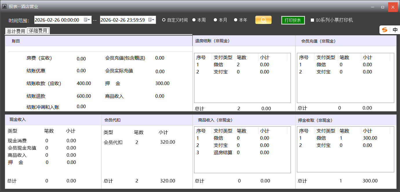 点击详细费用可以看到详细的营业收入账单商品收入,房费收入,会员消费信息等。