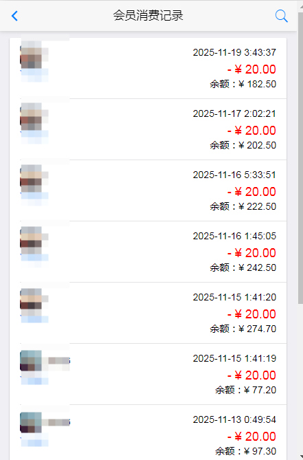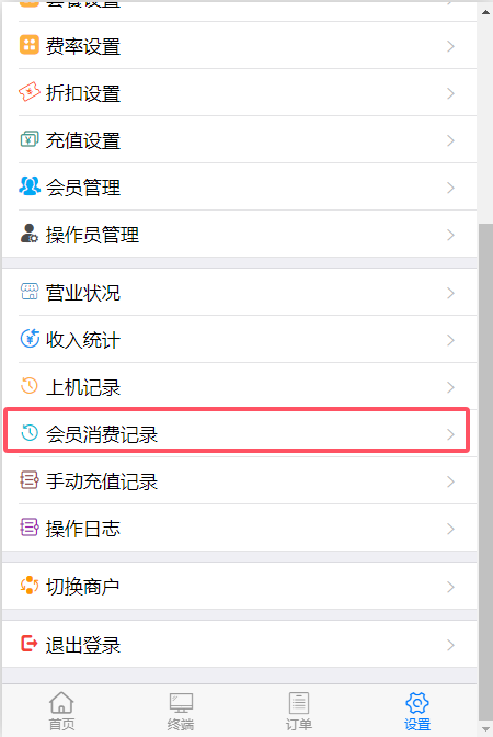 点右下角 设置——会员消费记录——右上角可以输入会员昵称 查询会员消费明细记录;